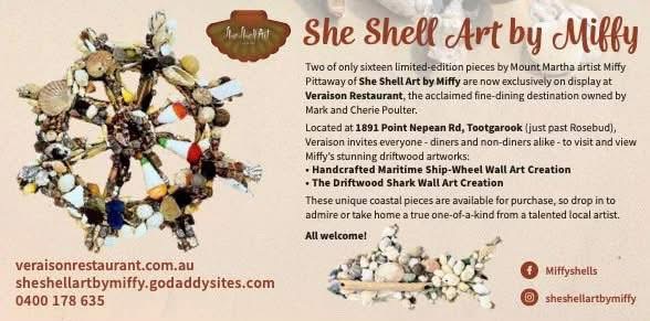 In her late forties, Miffy Pittaway is deeply passionate about seashells and their wondrous beauty. This piece also includes pre-purchased white carrie seashells sourced internationally, along with visually stunning toffee-colored sea glass collected from the magnificent Flinders Beach in Victoria, Australia.